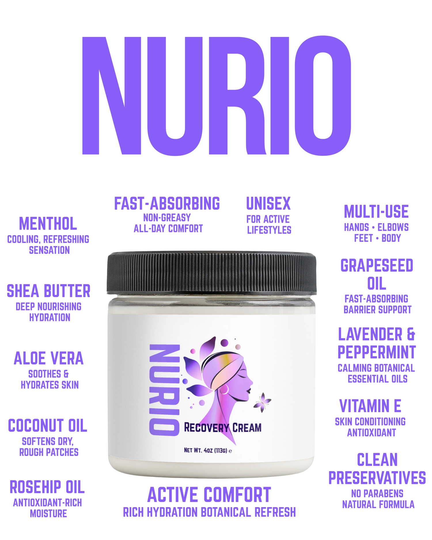 Menthol provides a cooling, refreshing sensation. Shea butter, coconut oil, and aloe deeply hydrate dry, overworked skin. Grapeseed and rosehip oils support skin barrier with antioxidants. Lavender and peppermint essential oils calm and soothe. Fast-absorbing, non-greasy formula for hands, elbows, feet, and body. Clean ingredients, unisex design. All-day comfort for active lifestyles.